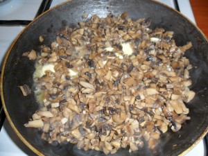 Шампиньоны промойте в проточной прохладной воде, обсушите полотенцем и нарежьте мелко. Далее их нужно обжарить на сливочном масле, до тех пор пока не выкипит из них вся вода.