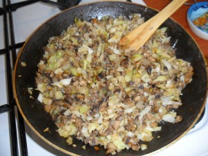 Лук репчатый и белокочанную капусту нарежьте мелкими кубиками и обжарьте по отдельности на разных сковородах в небольшом количестве растительного масла. Обжаренный лук и капусту добавьте в сковороду с грибами, посолите и поперчите по вкусу и немного потушите 5 минут.