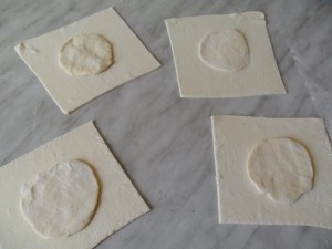 Приготовьте заранее готовое слоеное тесто, чтобы оно разморозилось и вы могли его легко раскатать. Возьмите один плат теста, раскатайте его и нарежьте острым ножом четыре одинаковых квадрата. Из излишков теста сделайте небольшие лепешки и положите на середину квадратов, для уплотнения, чтобы тесто при выпечке не прорвалось.