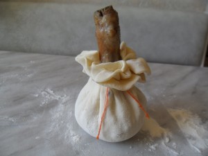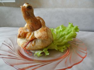 На каждый готовый квадрат положите начинку: грибы, лук и капуста, далее поставьте обжаренную ножку, поднимите аккуратно края, и зафиксируйте их нитью, но только сильно не завязывайте, а то тесто может порваться. Проделайте все то же самое с остальными ножками.