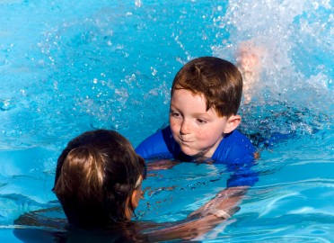 Первое. Основное препятствие в обучении плаванию состоит в том, что дети бояться погружения в воду, пытась не утонуть, этим мешая себе плыть. Сначала пусть ребенок, держась за вас, сделает вдох, опустит в воду только рот и сделает «фонтанчик», выдыхая ее. Далее пусть попробует опустить нос, а затем глаза, открыв их под водой. Если ваш ребенок боиться открывать глаза под водой, предложите ему очки, самое главное на этом этапе, заинтересовать его тем, что можно увидеть под водой.