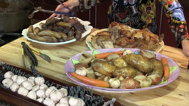 Возьмите рёбрышки и сосиски или, если вы больше любите птицу, то курицу. Посыпьте любыми специями и солью по вашему вкусу. В большую, смазанную маслом кастрюлю выложите мясо, целую морковь, картошку, лук, разрезанный пополам, чеснок прямо в шкурке. Залить недорогим вином или пивом, чтобы почти закрыть мясо. Закрыть фольгой и крышкой. В разогретую до 220С духовку ставим нашу кастрюлю на час, затем снижаем температуру до 150С и держим ещё 2 часа. Можно вынуть готовые овощи, а мясо поставить ещё ненадолго в духовку, чтобы оно красиво подрумянилось.