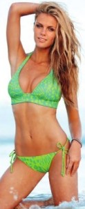 А вот темно-зеленый подойдет далеко не каждой. Зато салатовый купальник непременно стоит выбрать блондинкам, особенно тем, у кого стройная фигура. К тому же этот цвет будет с восторгом воспринят окружающими мужчинами, поскольку он придаст вам оттенок легкомысленности и беззаботности, а также поможет сыграть вам роль слабой и беззащитной. Ко всему прочему он молодит и освежает цвет кожи, и прекрасно ко всему подчеркнет ваш золотистый загар.