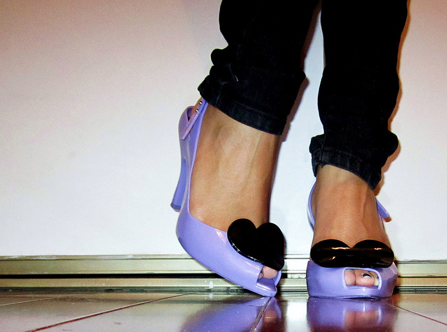 Изначально слово “босоножки” возникло от словосочетания “босая нога”, поэтому не стоит “изобретать велосипед”. Это также касается туфлей с открытым мыском, такие туфли также обуваются на босую ногу. Колготки и красивые чулки оставьте в сочетании с изящными туфлями на каблуке.