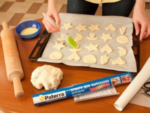 Бумага для выпечки может использоваться для раскатывания тонких лепешек из теста, вместе с бумагой их удобно переносить на противень, тесто на пути к духовке не порвется. Песочное тесто вообще удобно раскатывать между двумя слоями такой бумаги. Кстати, для этого пищевая пленка тоже подойдет.