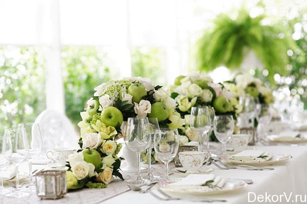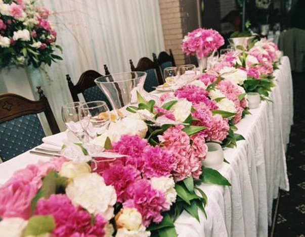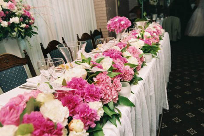Если вы решили искусно декорировать свадебный зал композициями в параллельном направлении, то следует взять во внимание, что букеты необходимо располагать радами. Не последнее место в оформлении зала играет свадебная палитра. Отдавайте предпочтение пастельной цветовой гамме: лиловой, белой, нежно – розовой, персиковой и зеленой, которая добавит нотки свежести и разнообразит креативные композиции. Размещение композиций может быть горизонтальным либо диагональным. Возьмите на заметку, что ряд, который находится к вам ближе можно составить из цветов одного сорта и единого оттенка. А вот последующие должны контрастировать с передним. Поместите композиции в резервуары различной формы. При этом они могут быть декорированы переливающимися камнями, что добавит букетам особенную изюминку.