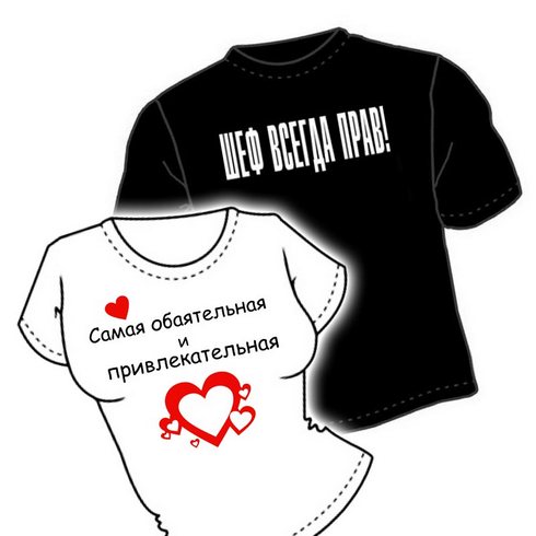 Конечно, такая продукция, как парные футболки для влюбленных с надписями типа: «Паша + Маша» или «Лена + Саша» будет более востребована юными членами нашего общества. Но, во-первых, надписи могут быть более интересными и не так явно указывать на возрастную категорию, а, во-вторых, такие прикольные футболочки вполне подойдут и для супружеской четы, у которой все в порядке с чувством юмора. Конечно, на работу в офис футболку с надписью «Я от тебя балдею, Натка!» не оденешь, но на даче или отдыхе – самое то.