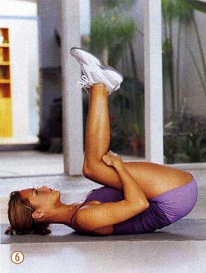 6. Обратное скручивание. Лягте на пол, на спину, согните колени и подтяните их к груди. Обхватите бедра руками и слегка потяните ан себя так, чтобы поясница оторвалась от пола, и позвоночник немного округлился. Для более глубокой растяжки напрягите мышцы живота. Растягиваются мышцы ягодиц и разгибатели позвоночника.