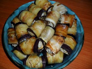 6. Распределить всю начинку на баклажанные полоски и завернуть в рулетики.
